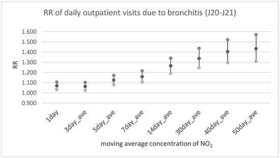 The relative risk of daily outpatient visits due to bronchitis (J20–J21 according to ICD-10) in relation to an increase of NO2 concentration by IQR = 12.67 µg/m3.