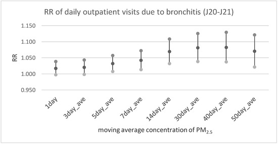 The relative risk of daily outpatient visits due to bronchitis (J20–J21 according to ICD-10) in relation to an increase of PM2.5 concentration by IQR = 22.5 µg/m3.