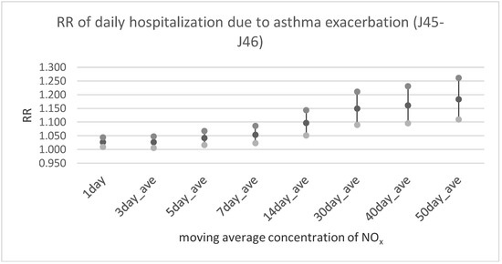 Table 3 and Figure 2, Figure 3 and Figure 4 illustrate the results of multivariable analysis assessing the risk ratio of daily outpatient visits or hospitalization due to bronchitis and asthma exacerbation related to the pollutants’ concentration increase by the unit (interquartile range value—IQR). Exposure was expressed by the moving average concentration. It is interesting that the relationship between nitrogen oxides and bronchitis risk ratio was statistically significant in every time lag, assumed way of exposure assessment (including the 1-day moving average concentration). In the case of PM2.5 a significant effect was observed only for longer exposure periods (starting from the 5-day moving average concentration in case of outpatient visits and 14-days moving average concentration for hospitalization). Similarly, in the case of asthma exacerbation statistically significant dose-response was observed for all NOx and NO2 averaged exposure period, and for both health outcomes (outpatient visits and hospitalization). The relationship between PM2.5 exposure and respiratory health problems was weaker and statistically significant only for longer exposure periods.