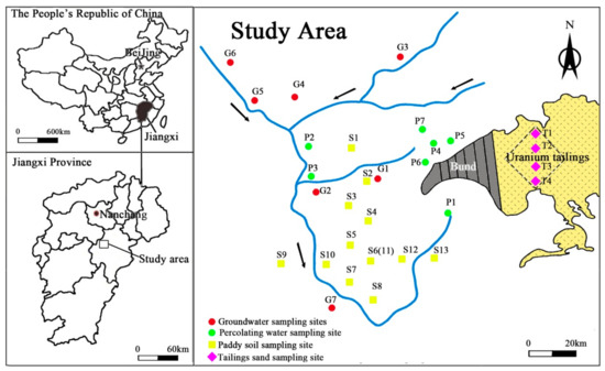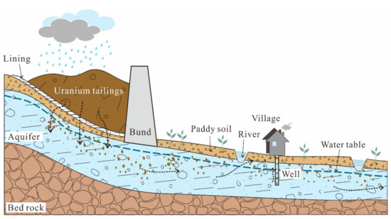The impact of radionuclides produced during the processes of U mining has significantly received public concern. The chemical and radiological toxicity of U shows an obvious biological effect and poses a threat to humans [7]. U occurs widely in soils, natural waters, air, plants, and animals [8,9,10]. Long-term intake of U-contaminated groundwater or crops grown in contaminated soils causes a great damage to human health. Cases have been reported that genotoxic effects and immunotoxicity resulting from U. Analyses of trace elements and C reactive protein were carried out for blood samples collected from residents living near a U mine to investigate the impact of U mining, showing that it did cause some public health problems to the residents [11]. Thus, it is necessary to investigate the characteristics of the pollutants in soil-water systems near a U mill tailings ponds.