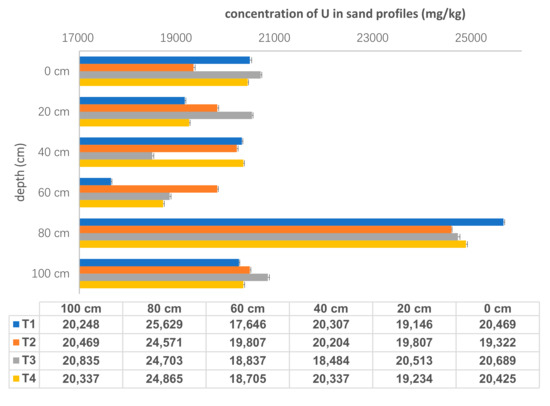 Total concentrations of U in each tailings sand samples were shown in Figure 3. U concentrations ranged from 1.76 × 104 ± 17 mg/kg to 2.56 × 104 ± 23 mg/kg, and showed vertical variation with all highest values at the depth of 80 cm. The average value of U concentration for all four sand samples at 80 cm was 2.49× 104 ± 2.40× 102 mg/kg, while U concentrations for other five layers were approximately 2.00 × 104 mg/kg. There was no obvious difference in the total U concentrations among different sampling points (T1: 1.23 × 105 mg/kg, T2: 1.24 × 105 mg/kg, T3: 1.24 × 105 mg/kg and T4: 1.24 × 105 mg/kg). It indicates that U was distributed evenly in the tailings sand and migrated consistently in the horizontal direction.