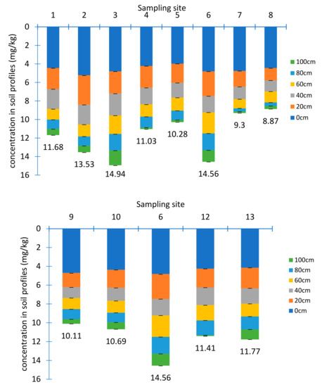 Similarly, for paddy soil, samples were collected from 12 sampling points at the depth of 0, 20, 40, 60, 80 and 100 cm below land surface, respectively. To avoid cross-contamination, sampling location were distributed in cross within a grid of 100 m × 100 m (Figure 2). After about 1 kg soil being collected, it was preserved in a cloth bag with label from S1 to S13, as shown in Figure 2.