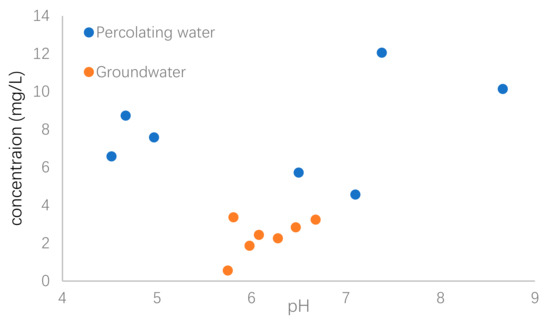 The percolating water could be a source of U in groundwater. In order to investigate the relationship of U concentration between surface water and groundwater, the variations of pH value as a function of U concentrations in both percolating water and groundwater were shown in Figure 5 as a comparison.