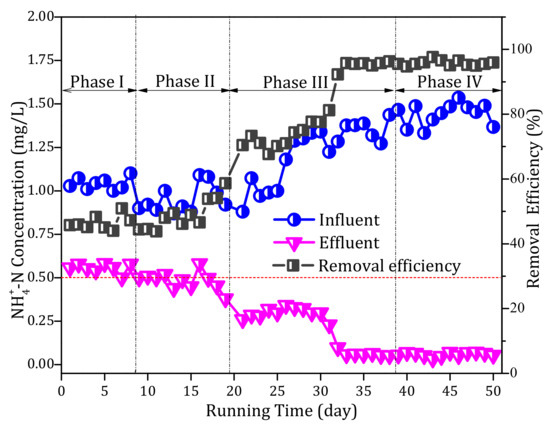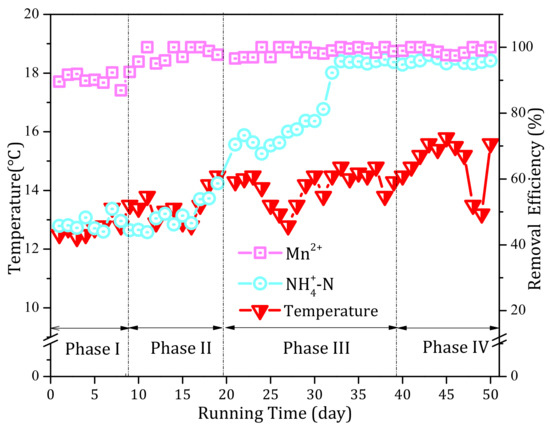 Figure 6 exhibits the variations in the influent temperature of the filter over the entire operational period. The influent temperature tended to rise over the period of operation. During phase II, the gradual improvement in the NH4+ and Mn2+ removal performances should have been independent of temperature as a result of the fluctuating temperature (12–14 °C) during this stage. Similarly, between days 23 and 27 of phase III, the temperature decreased obviously and the NH4+ removal performance continued to improve. During phase IV, when the temperature dropped significantly, the NH4+ and Mn2+ removal capacities remained stable. The results therefore demonstrated that temperature was not the main reason for the enhancement of the removal capability of the filter system over the entire operation period.