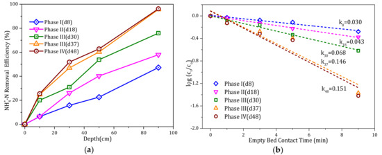 As shown in Figure 3b, the relationship between log{[NH4+]t/[NH4+]o} and the empty bed contact time (min) was linear. During phase I, the value of k8 (the rate constant on day 8) in the filter column was 0.030 min−1. As alkalinity was increased, the k value increased significantly to 0.146 min−1 on day 37 (phase III) and then further to 0.151 min−1 on day 48 after ceasing to add alkalinity (phase IV). This implies that the addition of alkalinity was beneficial for continuous NH4+ removal by the filter column.