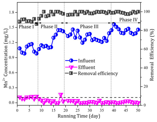 During the continuous operation of the pilot-scale filter system, the Mn2+ concentration in the influent and effluent were measured, as shown in Figure 4. During phase I, the influent alkalinity was 50–65 mg/L and the Mn2+ removal performance was always good. Specifically, when the influent Mn2+ concentration was 1 mg/L, the effluent Mn2+ concentration remained more or less constant and was always close to the limit of China’s drinking water quality standards (0.1 mg/L). The removal efficiency during phase I was ~85% (Figure 4), which improved considerably during phase II (after 10 days of operation) and reached up to 100% after the influent alkalinity was increased to 100 mg/L. When the influent Mn2+ concentration was increased from 1 to 1.5 mg/L during phase II, despite a small increase on day 18, the Mn2+ concentration in the effluent subsequently reduced to near zero. During phase III, when the influent alkalinity was increased to 150 mg/L, the Mn2+ concentration in the effluent remained near zero and the removal efficiency was consistently 100%. In addition, during phase IV, when no further alkalinity was added, the filter still showed an excellent Mn2+ removal performance, and the Mn2+ concentration in the effluent remained near zero (Figure 4). Hence, although the effect of alkalinity on the Mn2+ removal rate was not obvious, the Mn2+ removal capacity of the filter media increased from 1 to ≥ 1.5 mg/L.