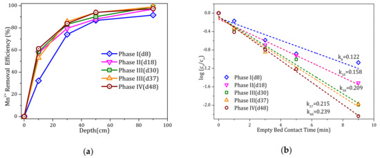 (a) Manganese (Mn2+) removal efficiency with filter column depth during different phases, and (b) linear regression analysis of Mn2+ depletion with the empty bed contact time during different phases. Day (d) and rate constant (k).