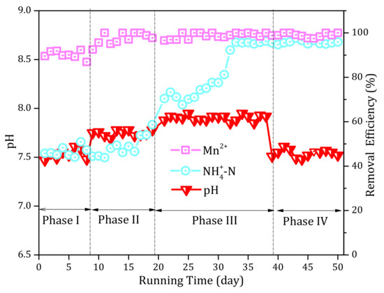 Figure 7 presents the influent pH values of the filter over the entire operation period. During phase I, the influent pH of the filter was ~7.5. When the alkalinity was increased to 100 mg/L (phase II) and 150 mg/L (phase III), the pH gradually increased to 7.7 and 7.85, respectively. Hence, with increasing alkalinity, the influent pH also increased. This was consistent with the improved NH4+ and Mn2+ removal efficiencies; hence, it is possible that the increased NH4+ and Mn2+ removal efficiencies might have arisen from pH. However, the pH decreased to 7.5 after ceasing to add alkalinity (phase IV), and yet the NH4+ and Mn2+ removal performance remained superior. Therefore, pH was not the main cause for the improved NH4+ and Mn2+ removal performances of the filter system.