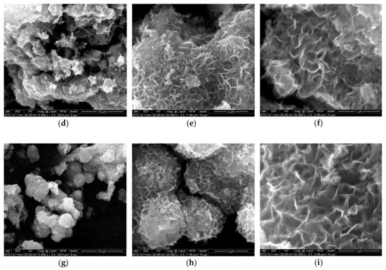 The build-up and surface microtopography of the Fe–Mn co-oxide at different phases during the entire operational period were analyzed by SEM, as shown in Figure 8. The images obtained from the Fe–Mn co-oxide sample showed that the media consisted of many small aggregated particles (Figure 8a,d,g), which led to a rough surface and a porous structure. Adsorption onto the oxide film should be the first step for the removal of NH4+ and Mn2+ by the Fe–Mn co-oxide, such that the relatively loose structure could facilitate the transfer and degradation of NH4+ and Mn2+. Moreover, it can be seen that the surface of the filter media exhibited relatively rough folds (Figure 8b,e,h), which were formed by the Fe–Mn co-oxide during the removal of pollutants adhered to the surface of the filter media. During phase I, the surface was reticular (Figure 8b,c) and could facilitate the contact and adsorption of pollutants; furthermore, NH4+ and Mn2+ were removed by the catalytic oxidation of the filter media. However, on the basis of the reticular structure, the surface of the filter media during phase III showed more folds (Figure 8e,f) that provided more adsorption sites, which was consistent with the increased removal activity with increased alkalinity during this stage. In addition, there was no significant difference in morphology between phases III and IV (Figure 8f,i), which was consistent with the well-maintained activity of the filter after ceasing to add alkalinity.