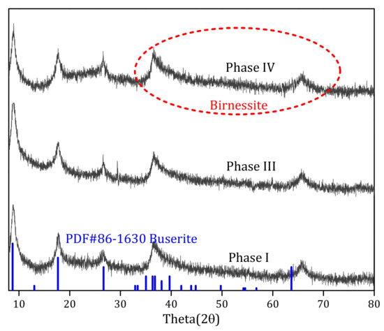To identify the crystal structure and crystallinity of the Fe–Mn co-oxide, samples from different phases were characterized by XRD. As demonstrated by Figure 9, the XRD patterns generally showed low peak intensities and broad diffraction peaks, which indicated a low crystallinity and a higher number of adsorption sites in the Fe–Mn co-oxide samples. These results agreed with the previous studies, which had a mixed phase structure (birnessite, buserite PDF#86-1630) [28,39]. Specifically, at different stages of operation, the crystal form and phase of the filter media did not show any obvious change, which indicated that NaHCO3 had no influence on the structure of the Fe–Mn co-oxide film. It was also found that the crystal structure stability of the Fe–Mn co-oxide was always better.