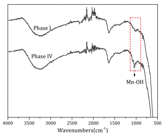 Fourier transform spectroscopy (FTIR) spectra of the Fe–Mn co-oxide during phases I and IV.