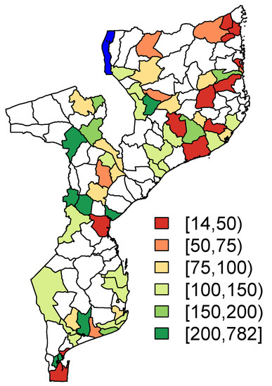 Note that the level of the enumeration areas is the spatial level at which the sampling scheme was conducted. The performed analyses, which will be discussed in the next sections, are performed at the spatial level of the districts, which are comprised of multiple enumeration areas. The geographical distribution of the district-specific sample sizes is visualized in Figure 1. Note that the small areas which are highlighted in white are the off-sample areas in the PSIA sample. The percentage of off-sample area is (). The area highlighted in blue in Figure 1 in the northern part of Mozambique represents part of Lake Malawi.