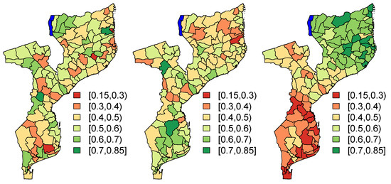 In this paper, all hierarchical models were investigated at the level of the district, while the survey was designed to obtain reliable (design-based) estimates at a larger geographical scale only. If the number of unsampled districts is higher then the studied , a spatial random effect at a higher geographical level could be needed [17]. This will model larger-scale spatial patterns and provide more reliable estimates if the amount of available data is sparse. This will be investigated in future research. A possible limitation of the proposed models is that only one source of auxiliary information was considered. As such, future research might include the investigation of multiple sources of auxiliary data.