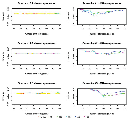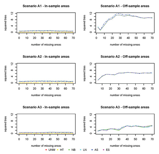 Figure 3, Figure 4 and Figure 5 show the squared bias, MSE and coverage as function of an increasing number of missing areas. Figures on the left hand side correspond to the in-sample areas, i.e., areas for which samples are available; figures on the right hand side correspond to off-sample areas. Top panels correspond to scenario of a weak spatial structure, middle panels to scenario of a mild spatial structure and bottom panels to scenario of a strong spatial structure. Colors correspond to the different models (UNW, HT, NB, LN, AS and ES). Results are also given in Tables S2–S7 in the Supplementary Materials.