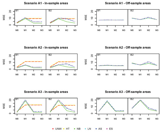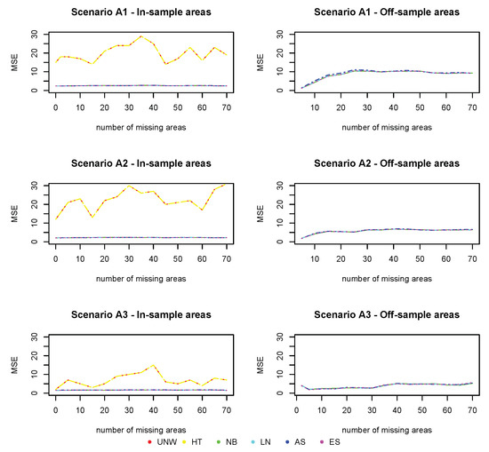 In contrast to the bias, the MSE of the design-based estimators (UNW and HT) in the in-sample areas (Figure 4) is much higher. This is due to the instability (and high variability) of the design-based estimators when the sample sizes in the areas are small. This is why the design-based estimators are not recommended when the analysis is at a smaller geographical level. All model-based estimators behave similarly, and have small MSE in the in-sample areas, unaffected by the number of missing areas or the strength of the spatial structure. The MSE in the off-sample areas is higher compared to the MSE in the in-sample areas, but smaller than those of the design-based estimators of the in-sample areas. The MSE increases with the number of missing areas, but levels off when the number of areas is above 30. The MSE is smaller for stronger spatial structures, even if the number of missing areas is high (up to ).