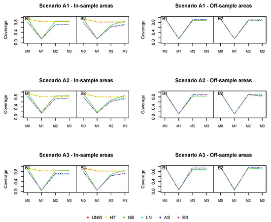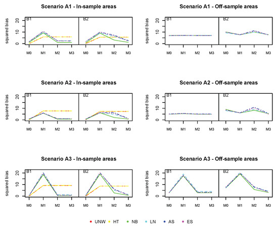 Figure 6, Figure 7 and Figure 8 show the squared bias, MSE and coverage of the different models (), corresponding to the different simulation scenarios. Figures on the left hand side correspond to the in-sample areas, i.e., areas for which samples are available; figures on the right hand side correspond to off-sample areas. Top panels correspond to scenario of a weak spatial structure, middle panels to scenario of a mild spatial structure and bottom panels to scenario of a strong spatial structure. Within each plot, the left panel corresponds to scenario in which the true prevalence is spatially structured; the right panel corresponds to scenario in which the true prevalence depends on energy and the spatial location. Colors correspond to the different models (UNW, HT, NB, LN, AS, and ES). Results are also given in Tables S8–S15 in the Supplementary Materials.