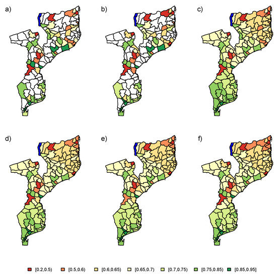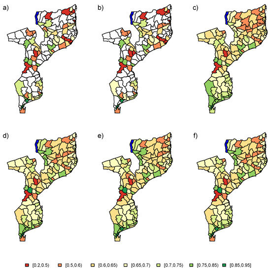 Firstly, the PSIA data set was analyzed using the baseline model (). The results of the data analysis using the six estimators (UNW, HT, NB, LN, AS, and ES) are visualized in Figure 9. The unsampled areas are highlighted in white, with no estimation in these areas based on the design-based estimators. The model-based methods provide predictions for the proportion of school attendance in these areas, by incorporation of the spatial correlation between the areas in the estimation process. Overall, based on the model-based estimators, we conclude that the proportion of school attendance decreases gradually from south to north, in addition to some outlying areas in the center of Mozambique. Results of the different model-based estimators are very similar. The resulting trend is very smooth. Based on the simulation results, we know that we should look at these results with caution, as the trend is based only on the neighborhood structure. From the simulation results, it would be recommended to use the NB, LN, AS, or ES method.