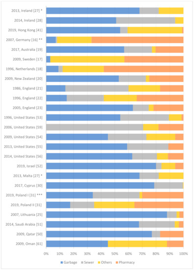 Databases have been collected by using the keywords “medicine” or “medication” or drugs” and “unused” or “wastage” or “disposal” or “management” in different combinations in the search bar in Google Scholar, Knowledge TM, and PubMed up to the end of September 2019. Articles without an empirical investigation into disposal practices, through a public survey, were excluded from reviewed articles. Included papers were analyzed, results were collected and presented in 100% stacked bar using Microsoft Excel® 2016. Countries were classified according to the Human Development Index (HDI) based on the report issued by the United Nations Development Programme (UNDP). More details about results are presented, also, in Table S1 in Supplementary Materials S1.