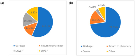Assuming that the disposal route via garbage or sewer as eco-unfriendly route, the percentage of eco-unfriendly disposal practice is 76.1%. This percentage agrees with the average of eco-unfriendly disposal method (72.7%) calculated considering all reviewed studies (Figure 2b).