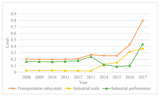 | Transportation subsystem (y) | Industrial scale | 0.3637 | Length of highways in operation (km) (y1) | 0.0844 |