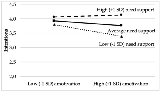 At the classroom level, perceived need-supportive climate failed to predict intentions (γ010 = 0.73, SE = 0.44, p > 0.05) and thus to provide support to Hypothesis 3. Yet, we found perceived classroom-level perceived need support to moderate the relation between amotivation and intentions to undertake extracurricular PA (γ010 = 0.41, SE = 0.20, p < 0.05). A test of simple slopes showed that the relation between amotivation was significant, and negative, among students belonging to low (i.e., 1 SD below the mean) or average (γ400 (−1 SD below the mean in perceived need support) = −0.24, SE = 0.07, z = −3.21, p < 0.01; and γ400 (average in perceived need support) = −0.10, SE = 0.04, z = −2.85, p < 0.01, respectively) but not high (1 SD above the mean) need-supportive classes (γ400 (+1 SD above the mean in perceived need support) = −0.03, SE = 0.08, z = 0.49, p > 0.05). This finding suggests that high levels of class-level perceived need support attenuated the negative associations between amotivation and intentions to undertake extracurricular PA. A graphical representation of this cross-level interaction is shown in Figure 1.