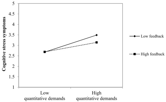 In contrast to control, feedback showed a significant buffer effect. The positive relationship between quantitative demands and cognitive stress symptoms is weaker when feedback is high. There is evidence to suggest that feedback is of special relevance for employees’ well-being. This is in line with the theoretical assumptions of Giesbers et al. who developed a theoretical framework for feedback provision in nursing settings [28]. Feedback is crucial for self-evaluation and also for the attainment of work goals, enabling employees to adapt their behavior and develop specific strategies that foster goal attainment [29,45]. In this regard, we assume that feedback is an important resource that helps employees to successfully address job demands.