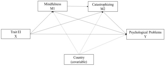 Based on our previous review of the literature and according to our rationale, the following hypotheses have been put forward: Psychopathology is negatively associated with Trait EI and mindfulness and positively associated with catastrophizing (Hypothesis 1); Trait EI, mindfulness, and catastrophizing are significant predictors of psychopathology (Hypothesis 2); Trait EI predicts psychopathology through its direct effect and through an indirect effect through mindfulness and catastrophizing (Hypothesis 3); this prediction exists above any effect of the country of origin (Hypothesis 4). This research was exploratory, and the hypotheses were not preregistered.