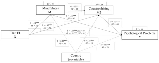 Double mediation model of the relationships among trait emotional intelligence, mindfulness skills, catastrophizing thoughts, and psychological problems, after controlling for country of origin (Portugal vs. Spain). Statistical diagram of the double mediation model for the expected influence of EI and its association through mindfulness and catastrophizing on psychological problems, and the country as a covariate. The values are represented with unstandardized regression coefficients. In the association between Trait EI and psychological problems, the value outside brackets represents the total effect, and the value in brackets represents the direct effect of the bootstrapping analysis of Trait EI on Psychological Problems after the inclusion of the mediating variables. *** p < 0.001.
