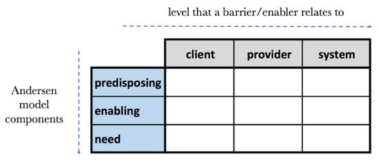 - Babitsch, B.; Gohl, D.; von Lengerke, T. Re-revisiting Andersen’s Behavioral Model of Health Services Use: A systematic review of studies from 1998-2011. Psychosoc. Med. 2012, 9, 11. Available online: http://www.ncbi.nlm.nih.gov/pubmed/23133505 (accessed on 23 September 2019).