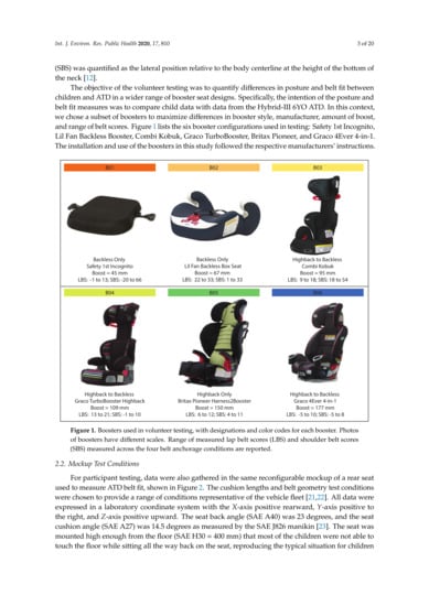 Booster evaluation commenced with review of the 2017 list of boosters that was compiled on the American Academy of Pediatrics website []. The range of styles listed included backless (cushions), highback-to-backless, highback only, 3-in-1, and combination. The booster ratings issued by the Insurance Institute for Highway Safety (IIHS) were also reviewed []. We chose to consider products that did not receive this rating; specifically, we selected one product rated as “not recommended”, two products rated as “good bet”, and one product rated as “check fit”. Since one of the objectives of this study was to examine the posture of children in boosters that did not “boost” as much as traditional booster products, we also reviewed product photos and evaluated three lower height products. One was rated as “best bet” by the IIHS and two were not rated by IIHS. The remaining four booster products (all rated as “best bets”) were selected to fill in the distribution of booster styles and heights while trying to vary manufacturers and belt routing features.