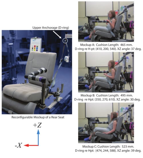 For participant testing, data were also gathered in the same reconfigurable mockup of a rear seat used to measure ATD belt fit, shown in Figure 2. The cushion lengths and belt geometry test conditions were chosen to provide a range of conditions representative of the vehicle fleet [,]. All data were expressed in a laboratory coordinate system with the X-axis positive rearward, Y-axis positive to the right, and Z-axis positive upward. The seat back angle (SAE A40) was 23 degrees, and the seat cushion angle (SAE A27) was 14.5 degrees as measured by the SAE J826 manikin []. The seat was mounted high enough from the floor (SAE H30 = 400 mm) that most of the children were not able to touch the floor while sitting all the way back on the seat, reproducing the typical situation for children in rear vehicle seats. Three mockup test conditions were evaluated, distinguished by seat cushion lengths of 465, 495, and 523 mm. Seat cushion length was measured using a tool that was developed in Huang and Reed [] to approximate the SAE corresponding J2732 dimension. The cushion length test conditions were selected to represent the median, mean, and maximum from the Huang and Reed study [].