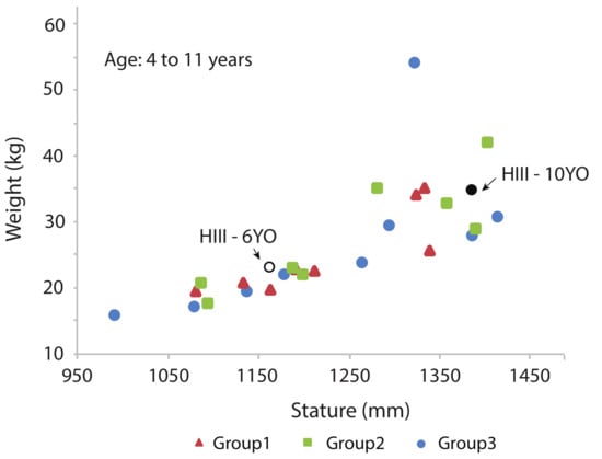 Twenty-five children (12 girls and 13 boys) between the ages of four and 12 years were recruited to participate in the study. Volunteers were recruited by word of mouth, online advertising, and the University of Michigan Human Research Recruiting Registry website (http://www.UMHealthResearch.org). The goal was to recruit children who spanned the range of potential users of belt positioning boosters with respect to stature and weight. This span included the range of the 6YO and 10YO Hybrid-III crash dummies. Participants were then assigned to three groups. The objective was for each group to have similar distributions in terms of sex, stature, and weight distribution. Each participant was tested in each mockup test condition: one in the no-booster condition and in two different boosters assigned to their group (a total of three conditions per participant). The weight-by-stature distribution of child participants for each group is shown in Figure 3 and Table 2. All test procedures were approved by the Institutional Review Board at the University of Michigan (HUM00123548). Written informed consent was obtained from the parent or guardian of each participant; each child assented orally.