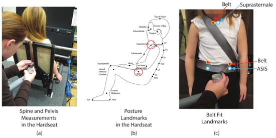 (a) Laboratory hardseat used to obtain posterior and anterior body landmarks in the same posture. (b) Schematic depiction of body landmarks that were digitized in the hardseat. (c) Digitizing lap and shoulder belt fit landmarks. ASIS, anterior superior iliac spine.