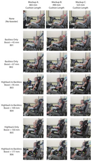 Representative child posture across the range of booster (B01–B06) configurations and mockup conditions.