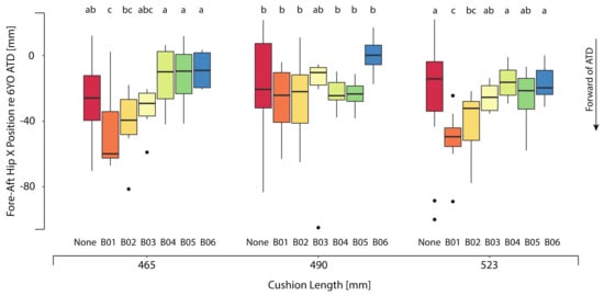 Variation of fore-aft hip X position with respect to the 6YO ATD. Negative hip X indicates that the child participant is forward of the 6YO ATD. Box plots show the median and interquartile range (25th to 75th). Whiskers extend to 1.5 * the interquartile range; outliers, defined as values exceeding 1.5 * the interquartile range, are shown as dots. Levels within a test condition that are separated by different letters are significantly different (p < 0.05).
