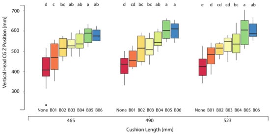 Variation of vertical headCG Z position. Positive vertical headCG Z indicates a head position higher than the ATD. Box plots show the median and interquartile range (25th to 75th). Whiskers extend to 1.5 * the interquartile range; outliers, defined as values exceeding 1.5 * interquartile range, are shown as dots. Levels within a test condition that are separated by different letters are significantly different (p < 0.05).