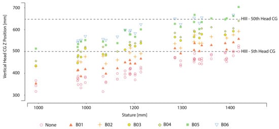 Figure 9 plots the vertical head location of the child volunteers versus their stature. The dashed lines represent the range of adult ATD head vertical CG locations, defined by Hybrid-III 5th female and Hybrid-III 50th male ATD installed on the mockup seat. In the lower height boosters, only children within a stature range of 1300–1450 mm for B01 and 1250–1400 mm for B02 had their heads located within the range of adult ATD head locations.