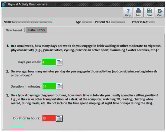 A tool allowing the assessment of weekly moderate-to-vigorous PA (min/w) and daily sitting-time (h/d) was implemented in the database/software “SClínico Cuidados de Saúde Primários“ (Figure 1) in September 2017. This platform is used as the electronic medical record in the PHC setting to track vital signs, code health problems, and support/record consultations with different health professionals. It is currently used in 300 PHC institutions by 13,000 health professionals.