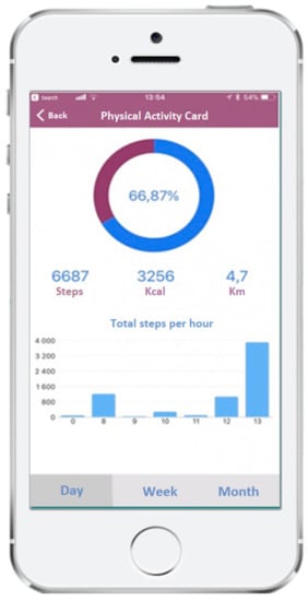 A new feature, the “Physical Activity Card”, became available in February 2018 allowing users to monitor their own PA level. This tool reads the smartphone’s accelerometer information and provides reports (daily, weekly, and monthly) based on the number of steps, distance (km), and energy expenditure (kcal), giving feedback to the user according to international standards (Figure 3).