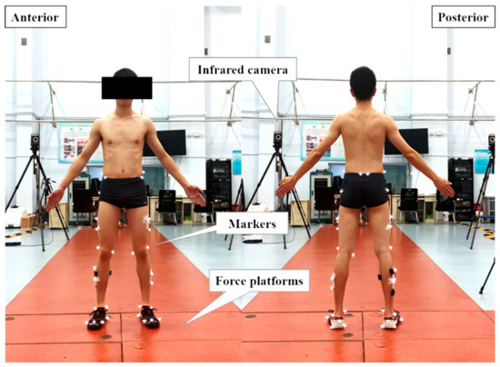 A 10-camera motion capture system (100 Hz, T40, Vicon Motion Inc., Oxford, United Kingdom) was used to collect kinematic data including hip, knee, and ankle joints (Figure 2). Two 90 × 60 × 10 cm Kistler 3D force platforms (9287B, Kistler Corporation, Winterthur, Switzerland) were used to collect ground reaction force (GRF) data at a sampling rate of 1000 Hz. Before the over-ground test, the participants performed a 5 min warm-up on a treadmill at optional running speed with the minimalist shoes, followed by 1 min 3.33 m/s experimental speed adaptation. During the over-ground test, three successful right foot contacts on the force plate were required. Its presence was not mentioned to avoid targeting problems. The speed during the over ground test was monitored to ensure the participants ran at 3.33 m/s using a Witty-Manual grating timing system (Witty wireless training timer, Microgate Corp., Bolzano, Italy) with a 5% acceptable variance. Both the GR and the MIN groups were tested before and after the intervention.
