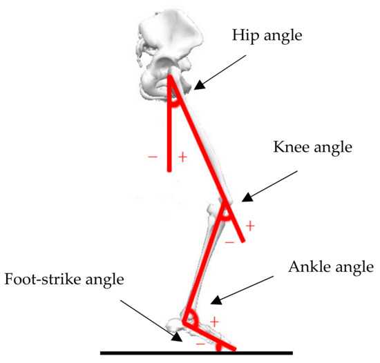 Kinematic variables included (1) ground contact time (CT), which represents the duration between touchdown to off-ground; (2) strike angle (θf) which refers to the angle between the foot and ground at initial contact; (3) angles of the hip, knee, and ankle joints when contacting the ground (θ0) and the maximum joint angle (θmax); and (4) joint angular velocities including the angular velocity at initial contact (ω0) and the maximum angular velocity of hip, knee, and ankle joints (ωp). The angle of ankle joint was 0° during standing, negative for extension/plantarflexion, and positive for flexion/dorsiflexion (Figure 3).