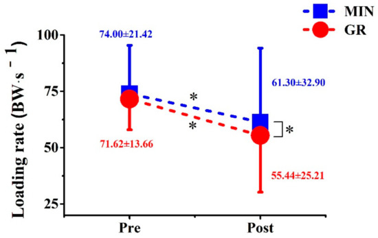 A significantly main effect of time on the loading rate was observed (Figure 4; Table 3), which was significantly reduced by 22.6% (GR) and 17.2% (MIN) after training (p < 0.001, p = 0.017). The loading rate of the GR group was lower than that of the MIN group after training (p = 0.015). No interaction effect was noted between time × group for any other GRF parameters in this study.