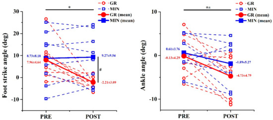 A significant main effect of time was observed on the foot-strike angle, ankle angle (Figure 5), and angular velocity of hip (p = 0.026, p = 0.011, p = 0.032, respectively) (Table 4). In addition, a significant interaction effect between time × group on the foot-strike angle was observed (p = 0.013). After the post-hoc test, the foot-strike angle of the GR group decreased by 10.3° after training (p = 0.015), but no difference was noted in the MIN group (p = 0.753) (Figure 5). The foot-strike angle of the GR group was significantly different from that of the MIN group in the post-test (p = 0.017). After training, the ankle angle significantly decreased by 4.6° (GR) and 2.5° (MIN) at touchdown, and the maximum angular velocity of hip joint increased by 15.2% (GR) and 25.2% (MIN). There was no interaction effect between time × group for any other kinematic parameters.