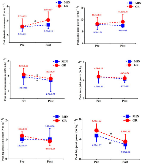 A significant main effect was observed on the peak ankle extension moment (p < 0.001), peak knee extension moment (p = 0.004), and peak power of the hip (p < 0.001) (Figure 6). The peak moment of the knee for the GR and MIN groups significantly decreased by 13.4% (GR) and 12.8% (MIN), respectively, after training, and the peak power of the hip for both groups was significantly decreased by 38.6% (GR) and 38.2% (MIN). In addition, a significant interaction effect was noted on the peak moment of ankle (p = 0.024). Specifically, the peak moment was increased by 17.8% after training in the GR group (p = 0.001), but no difference was observed in the MIN group.