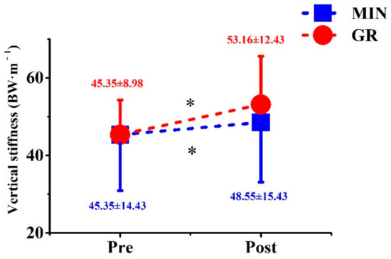 A significant main effect of time was observed on vertical stiffness (p = 0.035). After training, the vertical stiffness improved in the GR and MIN groups by 17.2% and 7.1%, respectively (Figure 7). However, no significant main effect or interaction was observed on the vertical displacement of CoG and the vertical GRF (Table 5).