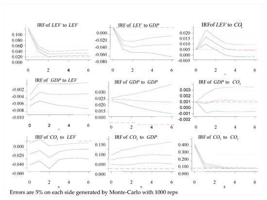 The panel impulse response functions (IRFs) describe the reaction of one variable in response to the variations in another variable in the system when all other shocks are kept equal to zero. Moreover, to examine the IRFs, it is especially important to determine an appropriate order of variables in the system []. As is known to all, the identifying assumption is that the variables that come earlier in the systems are more exogenous, while the ones that come later are more endogenous []. In our specification, we assume that financial leverage appears earlier than economic growth and carbon emissions for two reasons. First, financial deepening and development measured by financial leverage is treated as a technological factor in the model of neoclassical economic growth, while carbon emissions are treated as an undesirable output. Second, this model focuses only on China, so as the shocks to financial leverage are more likely to be more exogenous. For example, the global financial crisis that originated from the USA in 2008 is a notable shock to China. Moreover, we also suppose that current shocks to the growth in the economy create an influence on carbon emissions simultaneously, or even with a lag, while the shocks to carbon emissions cause an impact on economic growth only with a lag. Thus, economic growth appears before carbon emissions in the model. In a word, the order of variables is set as: financial leverage, economic growth, then carbon emissions.