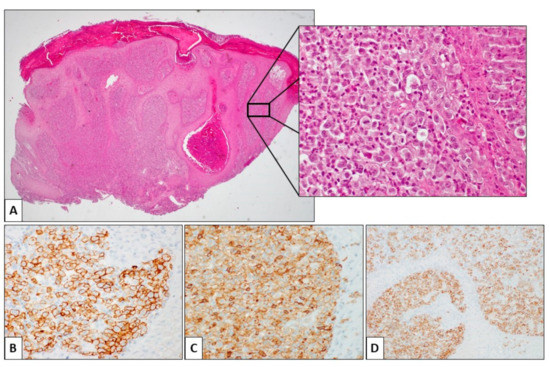 Histological features of primary cutaneous anaplastic large cell lymphoma (pcALCL). (A) This skin punch biopsy is characterized by a dense lymphoid population filling the dermis, without significant epidermotropism. The epidermis shows secondary changes, including hyperkeratosis and papillomatosis (Hematoxylin and eosin (H&E), 2.4×). Inset: the neoplastic population is composed of large-sized cells with abundant, slightly eosinophilic cytoplasm and roundish, atypical nuclei. Two mitotic figures are evident in the center of the field. Some neutrophils and eosinophils are scattered in the context of the neoplastic population (H&E, 20×). The large cells are positive for CD3 (B), CD4 (C), and CD30 (D) immunohistochemical staining.