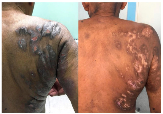 Clinical presentation of ALK- pcALCL with extensive ulcerated plaques located on the trunk and upper arms (a). Resolution of skin lesions, with central scarring and depigmentation after treatment (b).