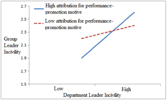 These two types of attribution for supervisor incivility affect subordinates’ behavioral responses by following the norm of reciprocity by the social exchange theory. That is, “benefits” received from one party may be “repaid” by conferring benefits on a third party [39]. Therefore, when a group leader interprets the department leader’s motive as performance promotion, the former might believe that the latter’s incivility is aligned with the former’s own personal interests and will be beneficial to the former’s long-term career development. In other words, the group leader will consider the department leader’s incivility is justified, reasonable, and conducive to the group leader’s own development. Based on social exchange theory, in order to reciprocate the department leader’s kindness, the group leader will implement more incivility on the group members and believe that such uncivil action can further improve the group members’ performance. In contrast, when the group leader interprets the department leader’s motive as injury initiation, the former would perceive the latter’s incivility as unethical and harmful to subordinates’ experiences in their organization. By the same token, in order to resist this kind of unethical and harmful behavior to the subordinates, the group leader will not impose more supervision incivility on the group members. Thus, we propose the following moderating hypothesis: