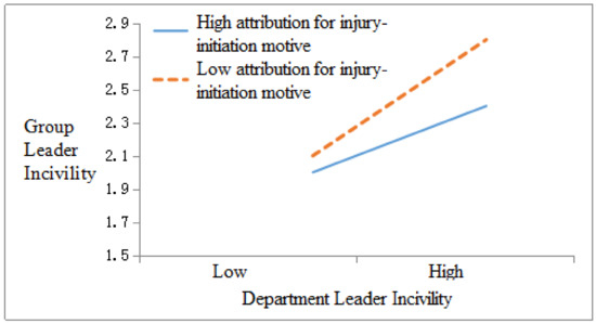 The interactive effect of department leader incivility and group leader attribution for injury initiation motive on group leader incivility.